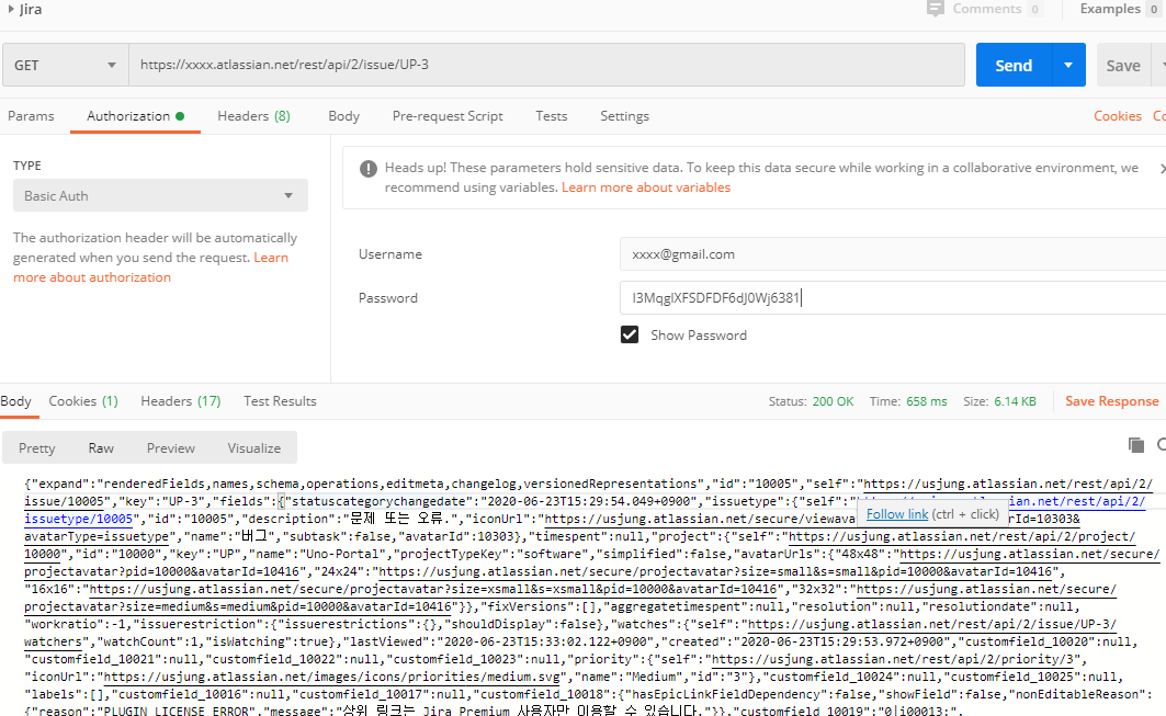 4. Postman 으로 테스트 (Get issue : GET /rest/api/2/issue/{issueIdOrKey})
